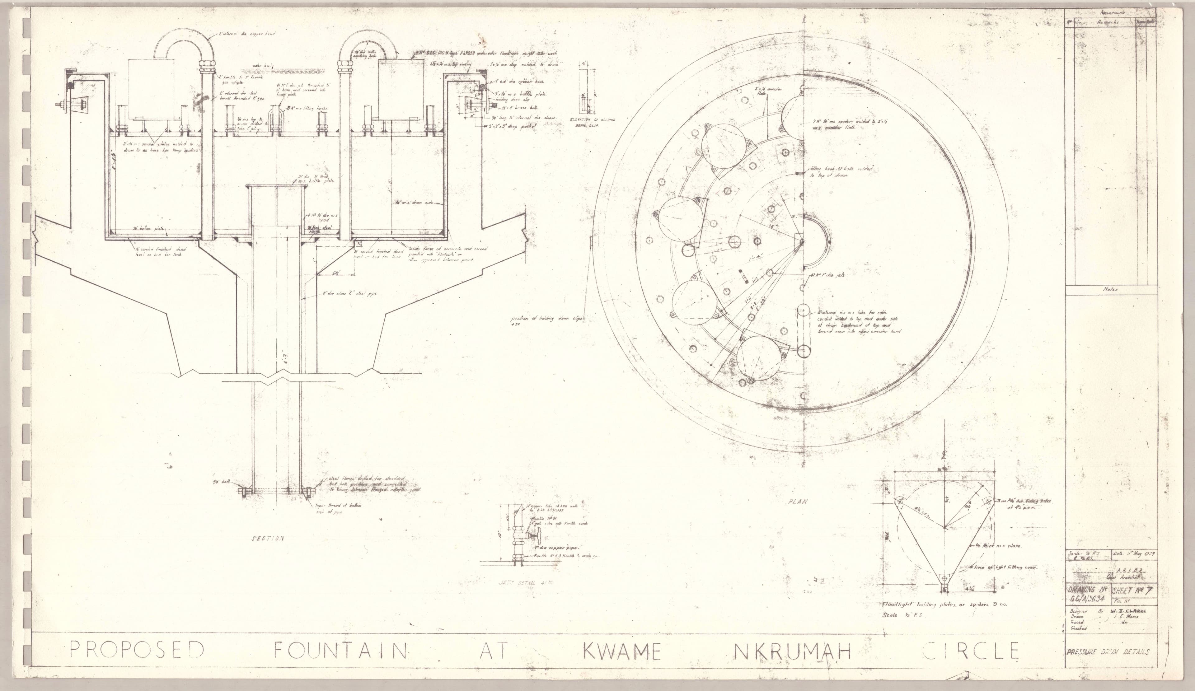 DTA Collections | Proposed design for a fountain at Kwame Nkrumah Circle, Accra, Ghana. Public Works Department, Ghana, 1959. Design by W. J. Clarke, drawn by William J.C. Allen. AA Archives.