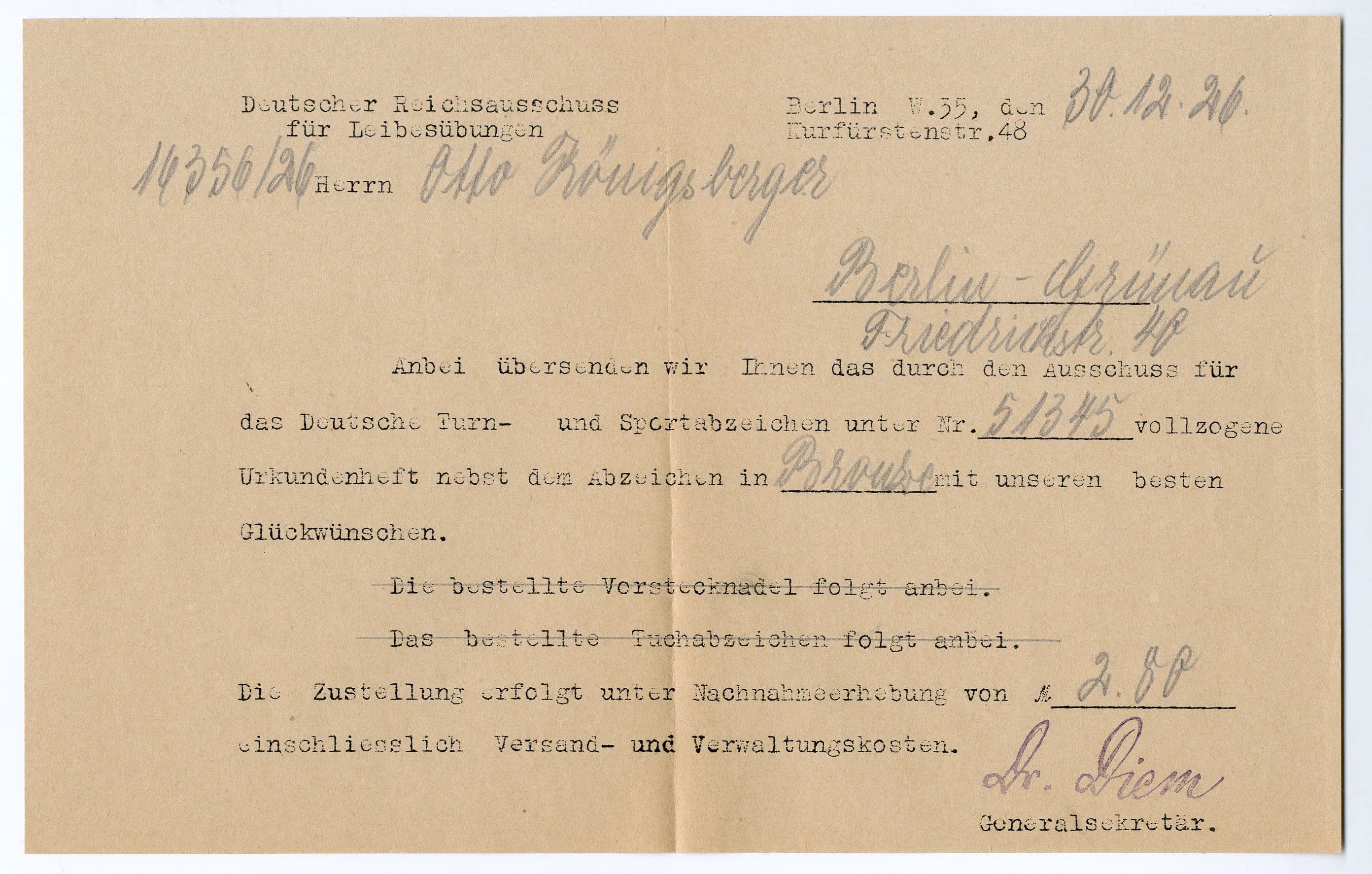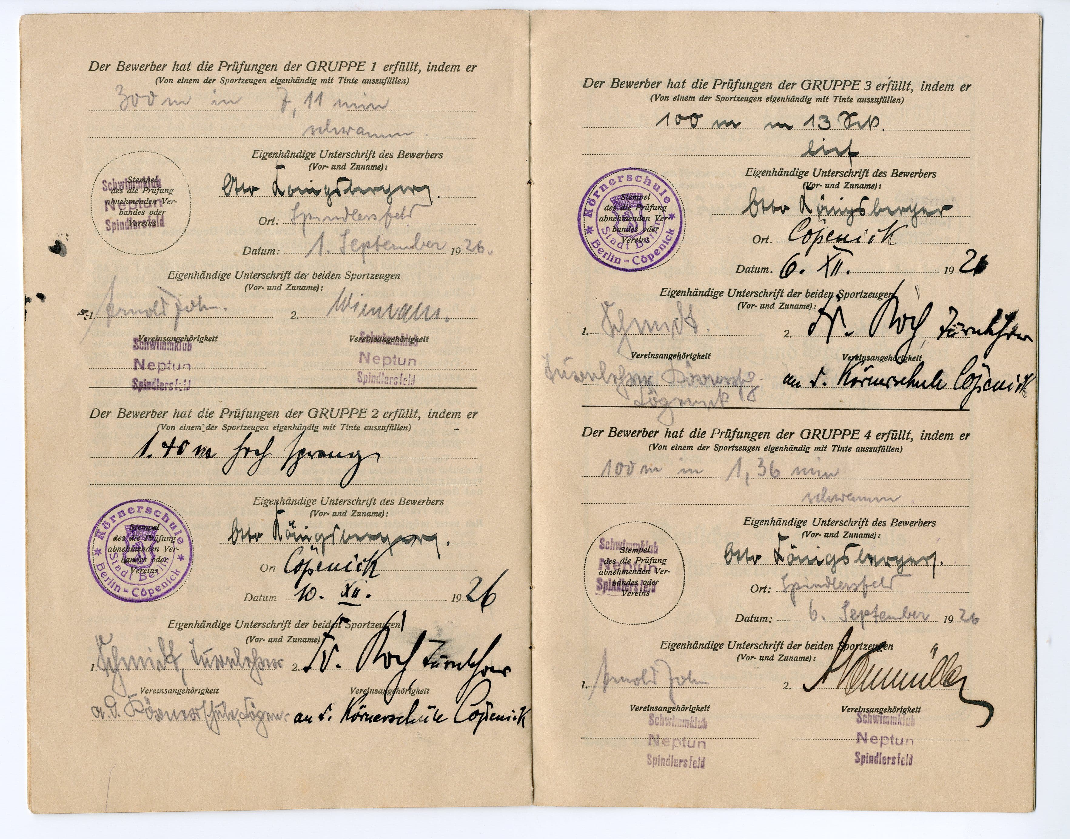 Otto Koenigsberger's Deutsches Turnund Sportabzeichen (gymnastics and sports badge) certification booklet, 1926.