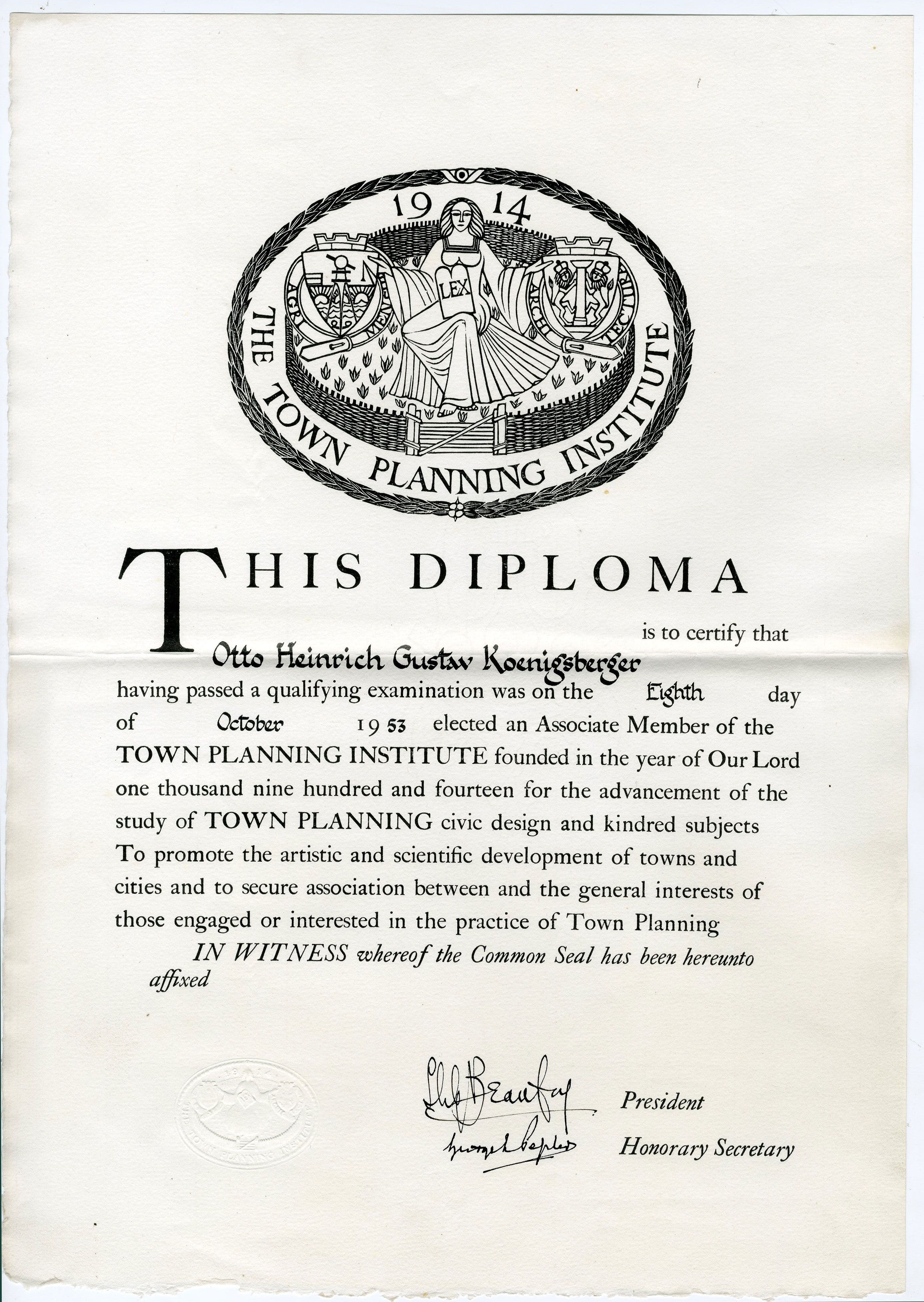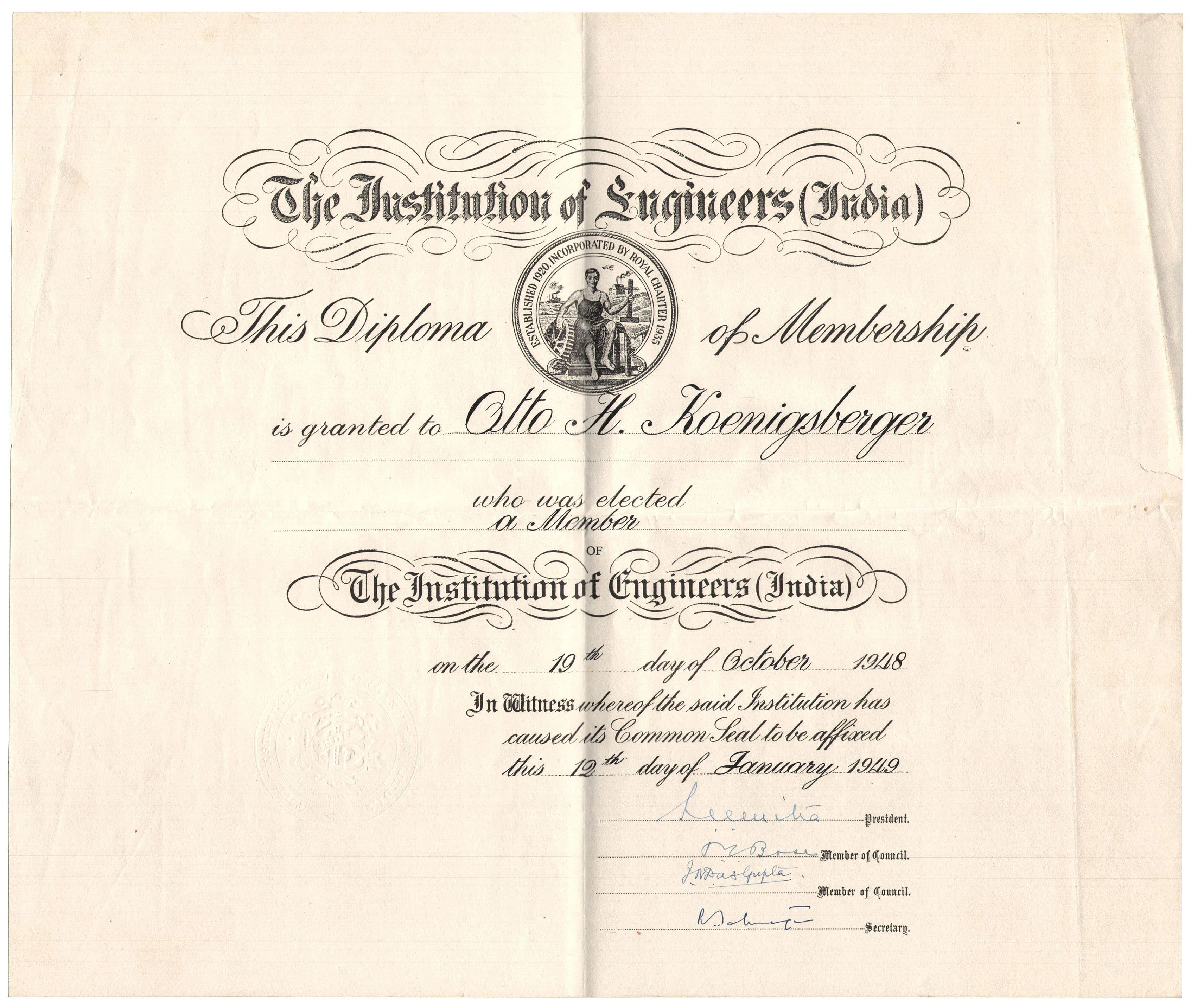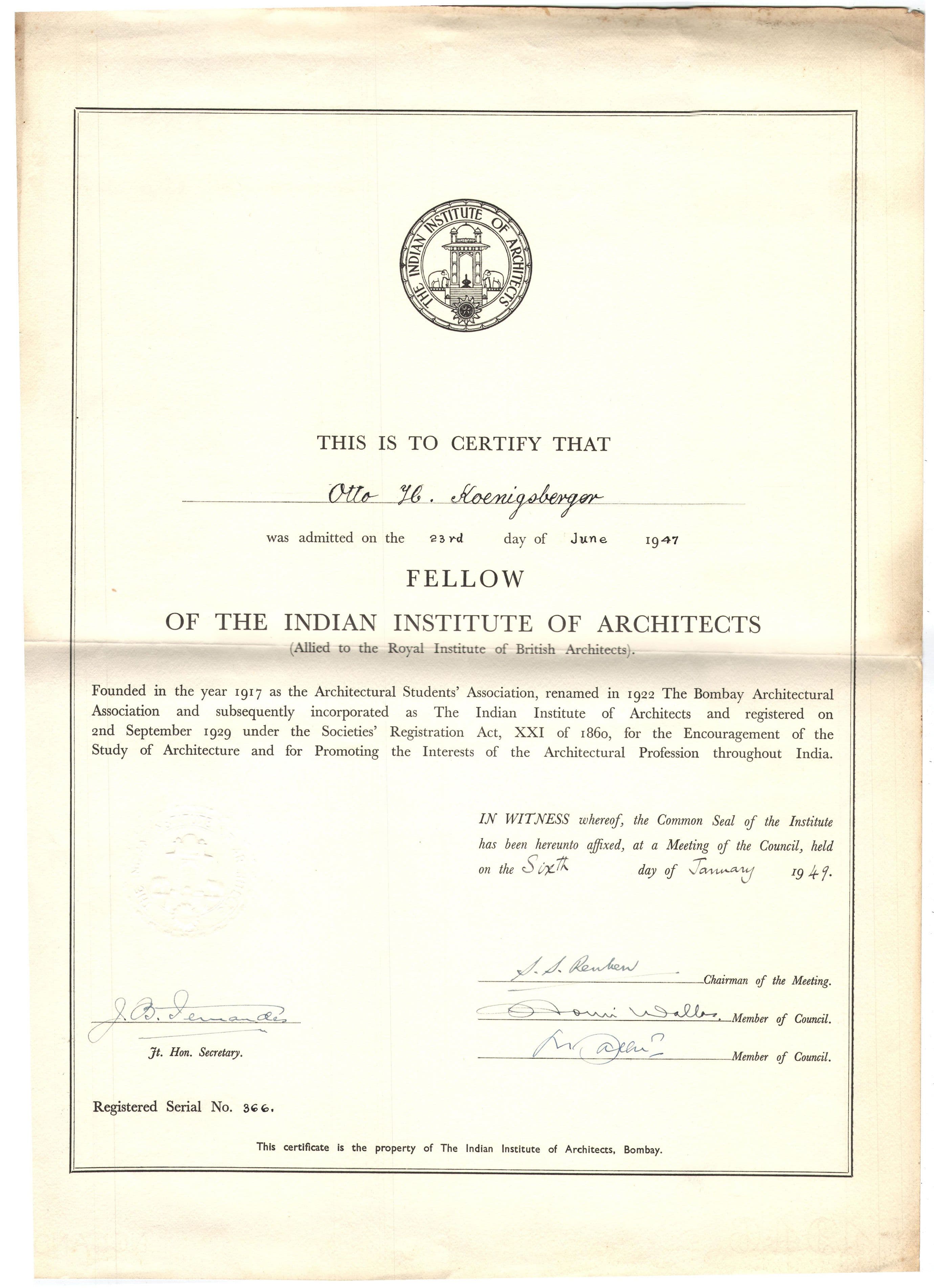 Comprises of certificates for Otto Koenigsberger's membership of professional organisations, including Associate Member and Member of the Instittute of Engineers (India), 1945, 1948; Fellow of the Indian Institute of Architects, 1948; Associate Member of the UK Town Planning Institute, 1953.