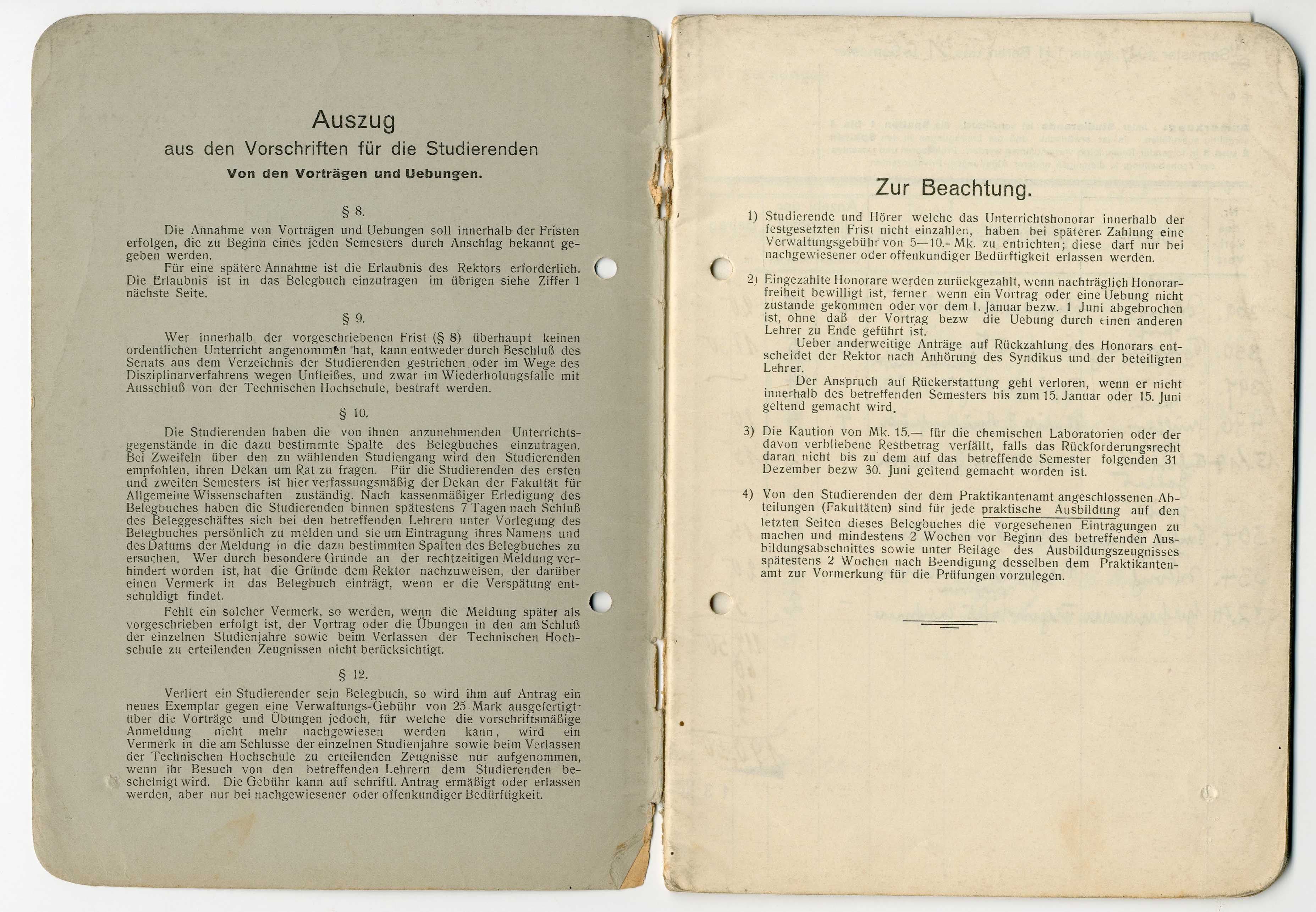 Otto Koenigsberger's 'belegbuch' (record of attendance and marks) for his studies at the Technische Hochschule, Berlin, 1927-1929.