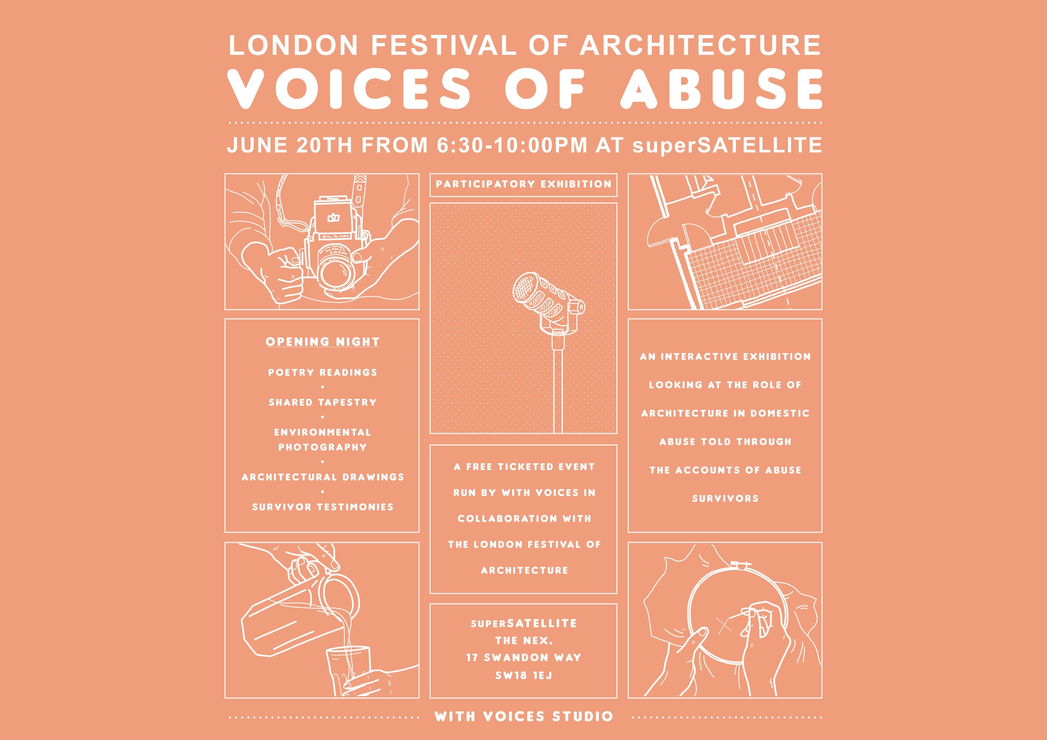 Giving authorship to the voices of the exhibition, a free ticketed opening night of Voices of Abuse will be held at SuperSatellite on Friday 20 June. This event will consider domestic abuse through architectural investigation. As part of the LFA, join the conversation with survivors, see pioneering research on the role of architecture in abuse and collaborate with other voices. Click here for more information and to book a ticket.
