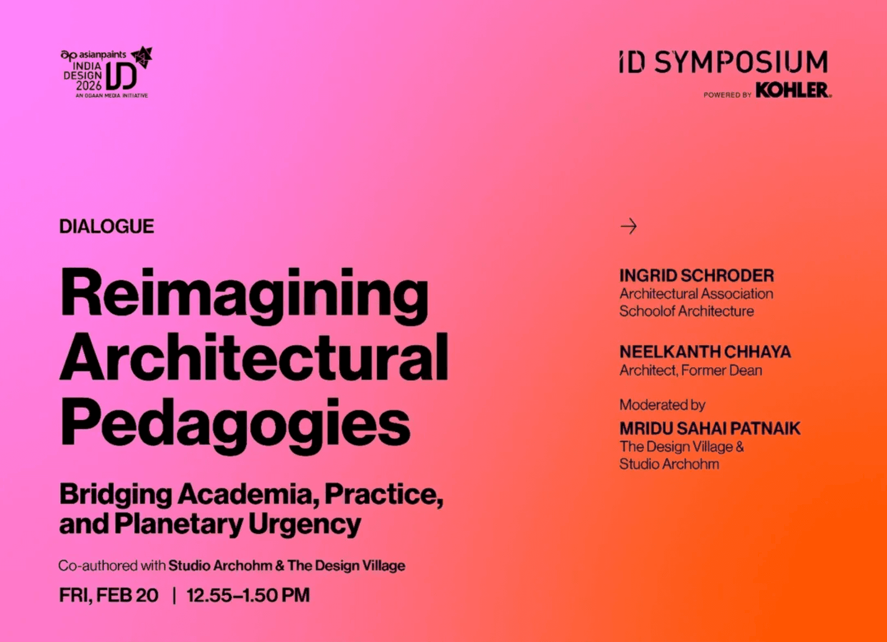 AA Director Ingrid Schroder has been invited to participate in the India Design ID Symposium in Delhi, part of India Design ID 2026 design week. For the session on Friday 20 February titled 'Reimagining Architectural Pedagogies: Bridging Academia, Practice and Planetary Urgency', Schroder will be in dialogue with Neelkanth Chhaya, architect and former Dean of CEPT University, in a conversation moderated by Mridu Sahai Patnaik (cofounder of The Design Village and a Partner at Studio Archohm.