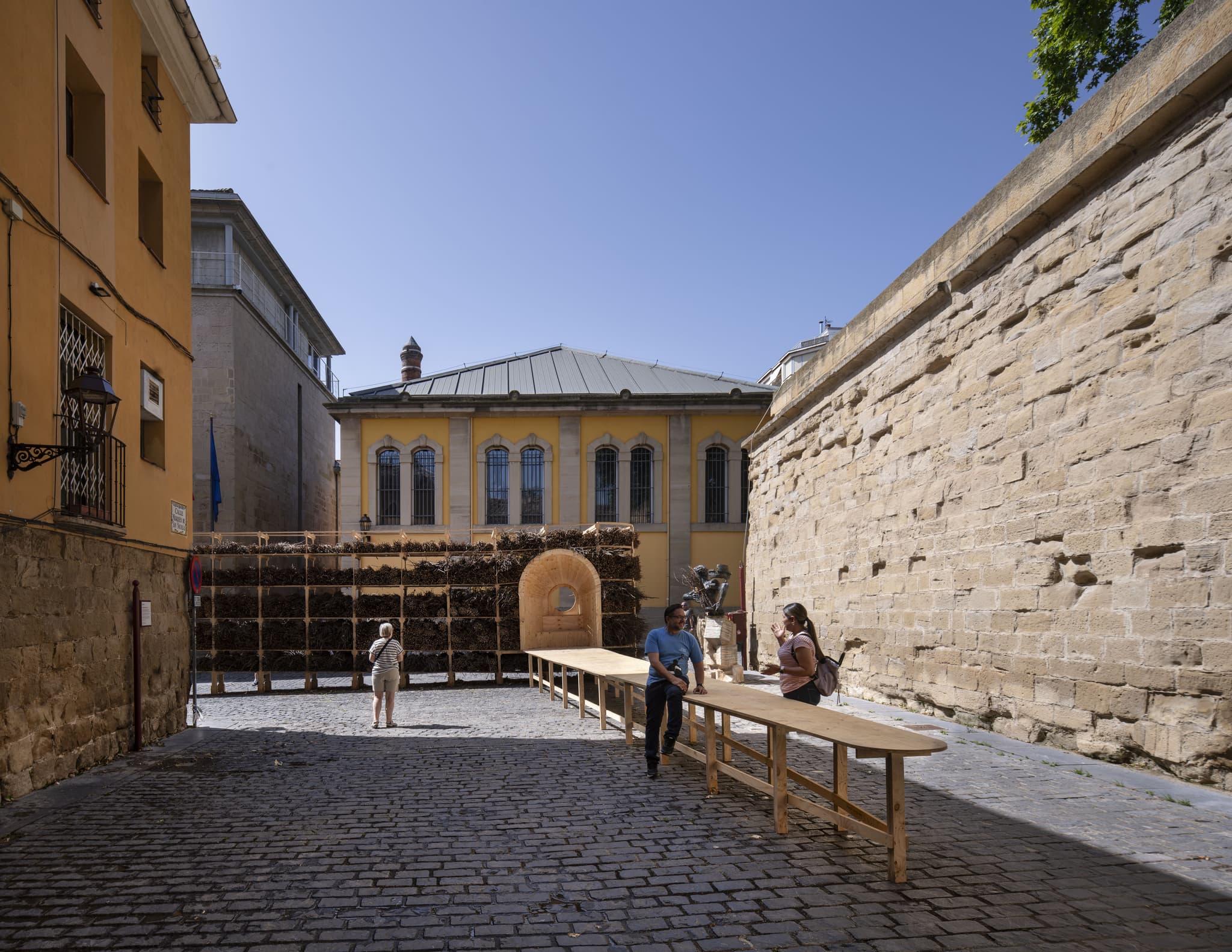 The project repurposes over 1,200 bundles of sarmientos, pruned vine branches typically discarded by nearby wineries, into a large-scale installation that redefines Logroño's Plaza del Revellín. Arranged into a curved, natural yet geometric formation, the densely stacked sarmientos create an inhabitable wooden structure over 16 metres long and four metres high, featuring seating areas, a raised viewpoint and a communal table. The installation filters light and provides shade through its interlaced branches, while an oculus frames views of the surrounding historic façades. Evoking the square's past as a gathering place, the design transforms it into a contemporary stage for social interaction, culminating in a collective barbecue that closes the material and ritual cycle.