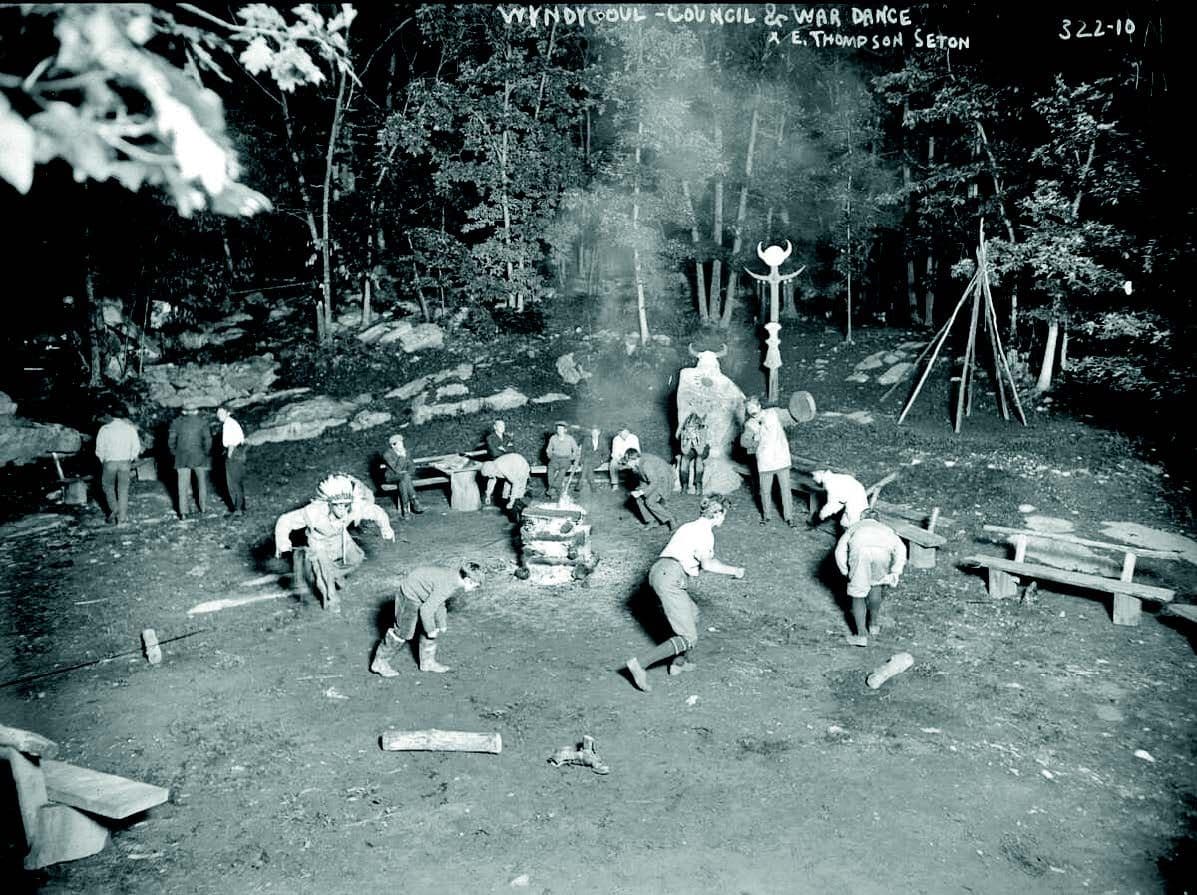 Image: Ernest Thompson Seton and Woodcraft Indians conducting a council and war dance at Wyndygoul, Cos Cob, Connecticut, 1908.