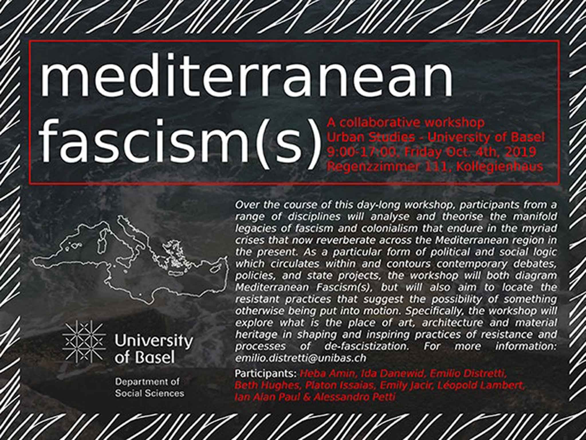 Mediterranean Fascism(s), a collaborative workshop. Urban Studies, Department of Social Sciences, University of Basel. Friday, October 4, 2019, 9am to 5pm at University of Basel, Regenzzimmer 111, Kollegienhaus. For more information visit the University of Basel website