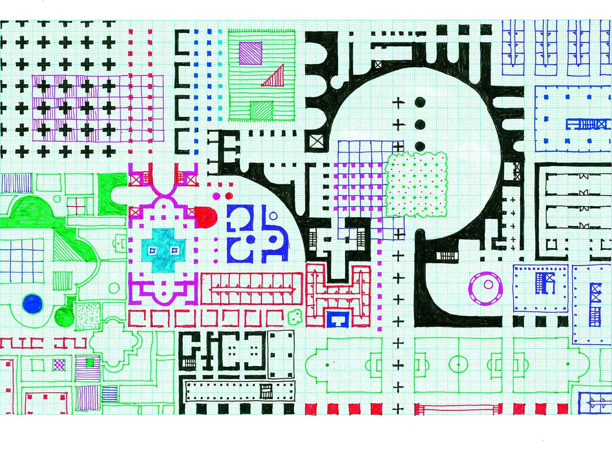 Conceived between 2011 and 2019, ‘Empire of Ice Cream’ is a series of thirteen meticulously filled graph paper drawings that show the remnants of architectural plans gathered from an assortment of historic and contemporary references. These elements are sometimes grand and monumental, others banal and generic, but all are summoned impromptu from Jacob’s memory; segments from Ancient Greek temples, football pitches, something Meisian, parts of a church, orchards, fountains, straightforward corridors, a chunk of Parliament, and a Buzzcock’s single cover are some examples.