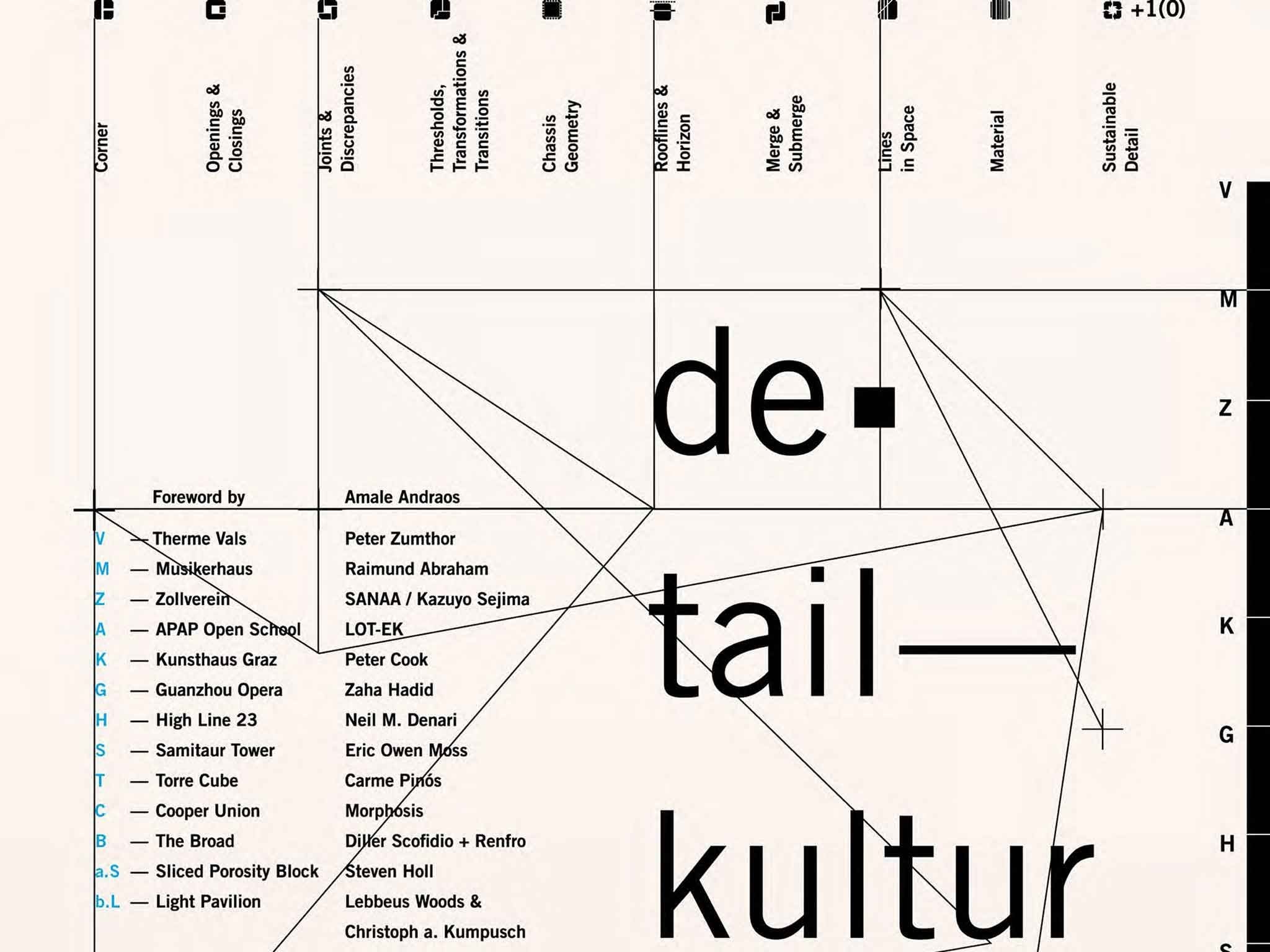Architectural details are typically communicated through technical drawings, and from such drawings details are archived, revised, and appropriated. This book presents case studies of the technical constitution and construction of 13 exemplary buildings realised in seven countries over the past 15 years. Through an investigative matrix of scaled drawings and analytical texts, the fundamental importance of the detail is rediscovered, giving insight into the technical complexities behind the often dynamic simplicity of the building’s final form. Including interviews with Zaha Hadid, Peter Zumthor, Eric Owen Moss, Kazuyo Sejima, Thom Mayne, Ada Tolla, Steven Holl, Carme Pinós. Foreword by Amale Andraos