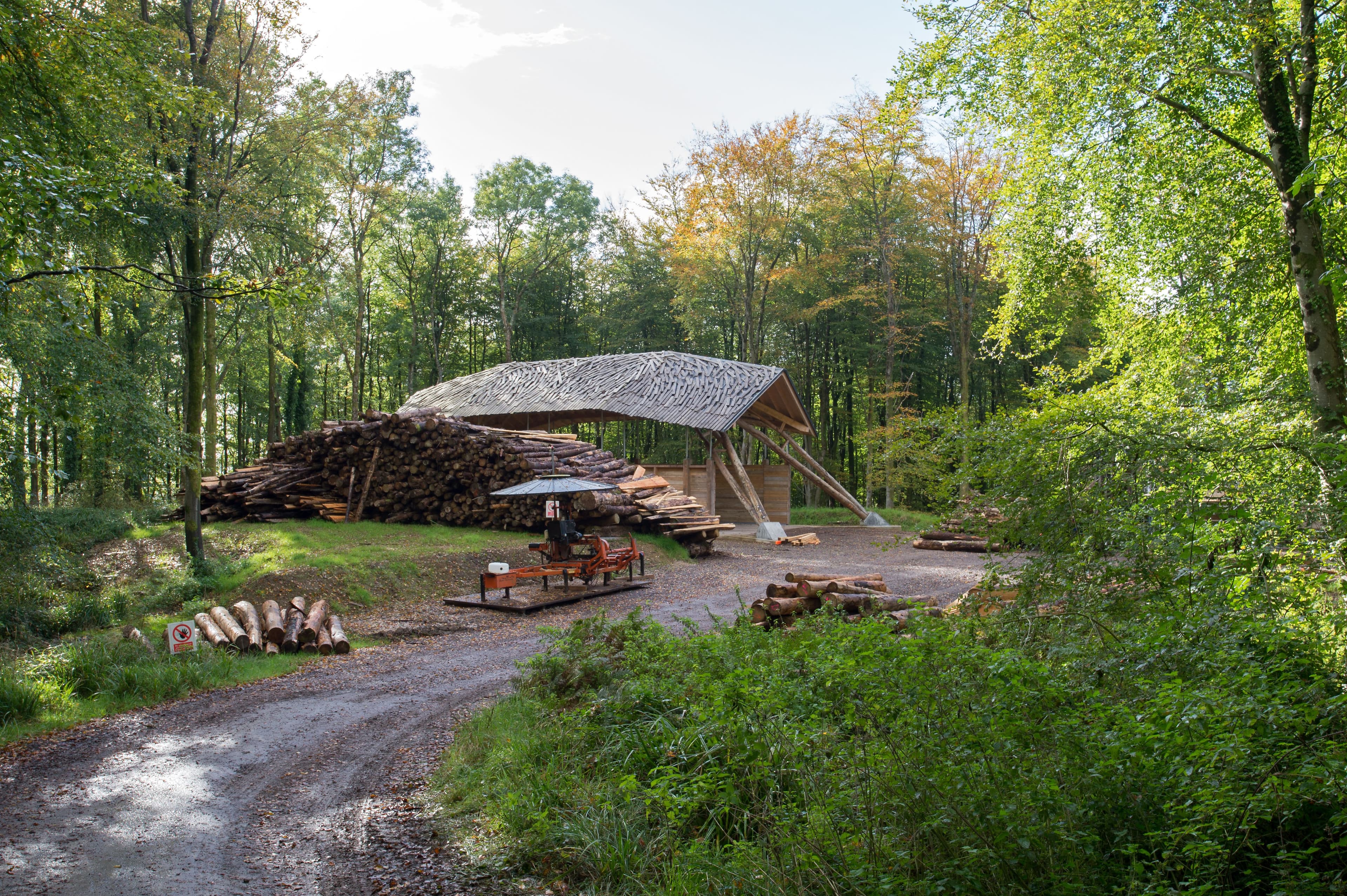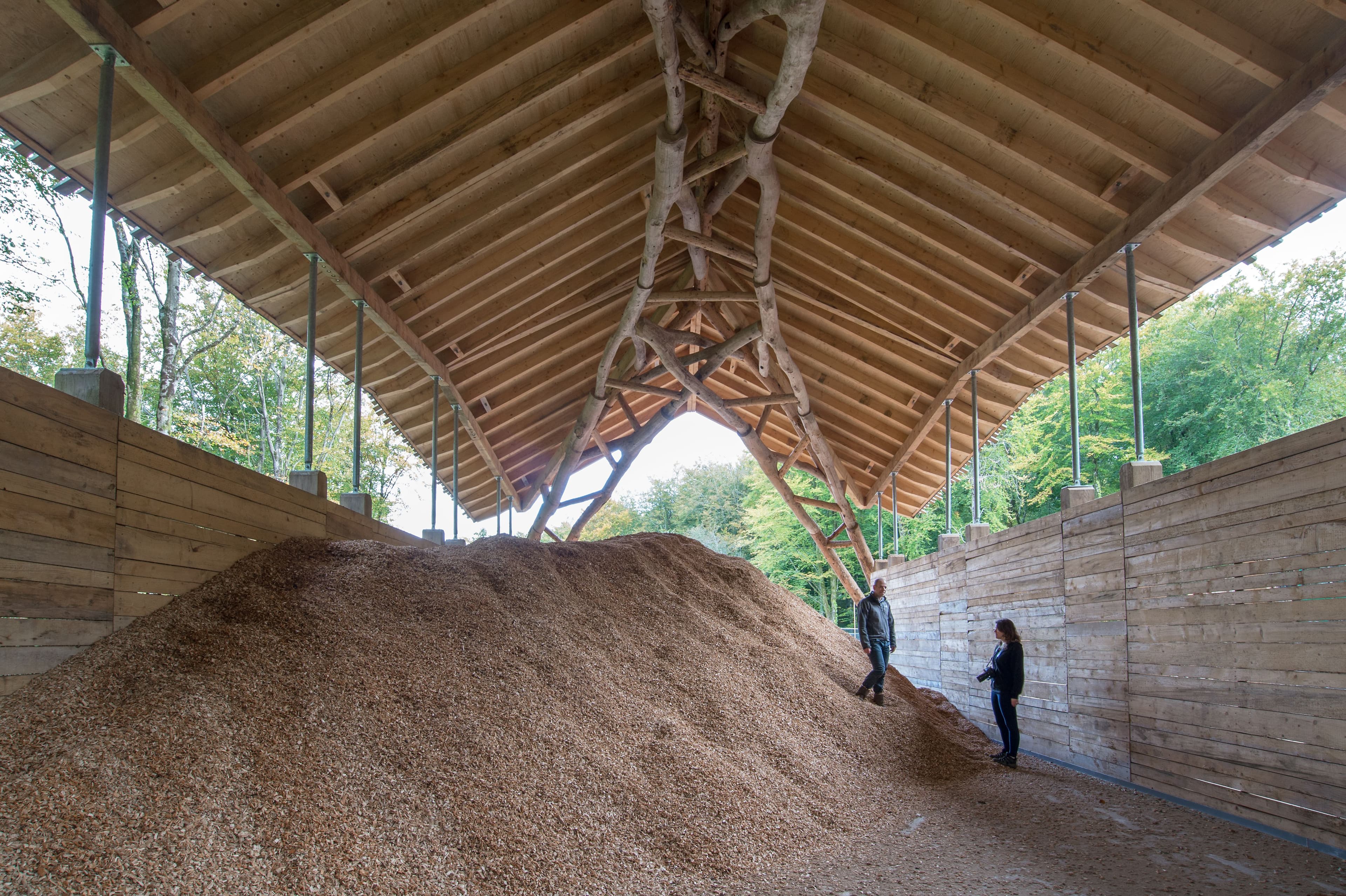 The Woodchip Barn structure provided storage for woodchip generated at Hooke Park to fuel the Biomass Boiler House. With a storage capacity of 400m3, it enabled the woodland to process and use its own timber for renewable heat production. The barn’s arching structure was formed from forked beech-tree components directly sourced from the surrounding woodland. The inherent form and structural capacity of the natural tree is transferred and exploited within the truss structure using 3D-scanning techniques and robotic milling to form the connections. Completed in 2016, the Barn reached the end of its lifespan in 2023 when its exposed timber footings degraded and the structure was safely demolished.